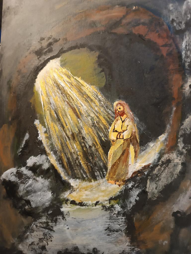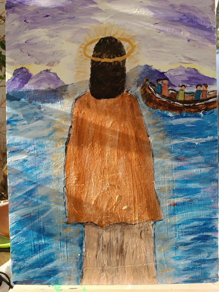 Jesus geht über das Wasser umgeben von goldenen Licht