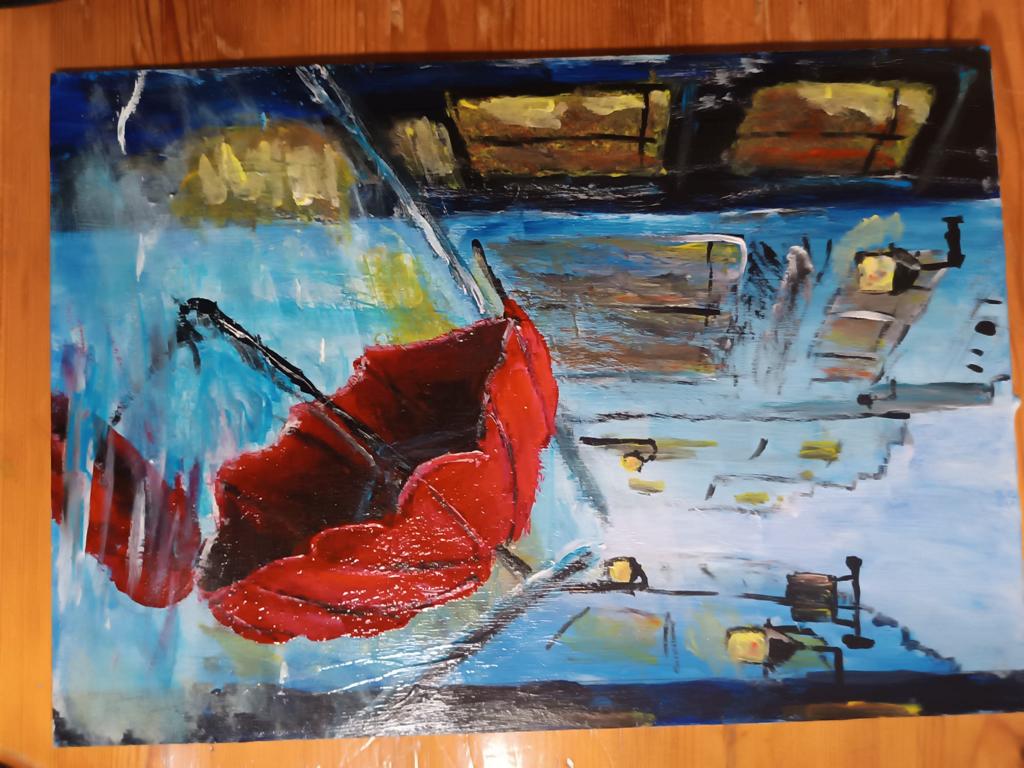Roter Regenschirm vergessen auf einer herbstlichen Straße
